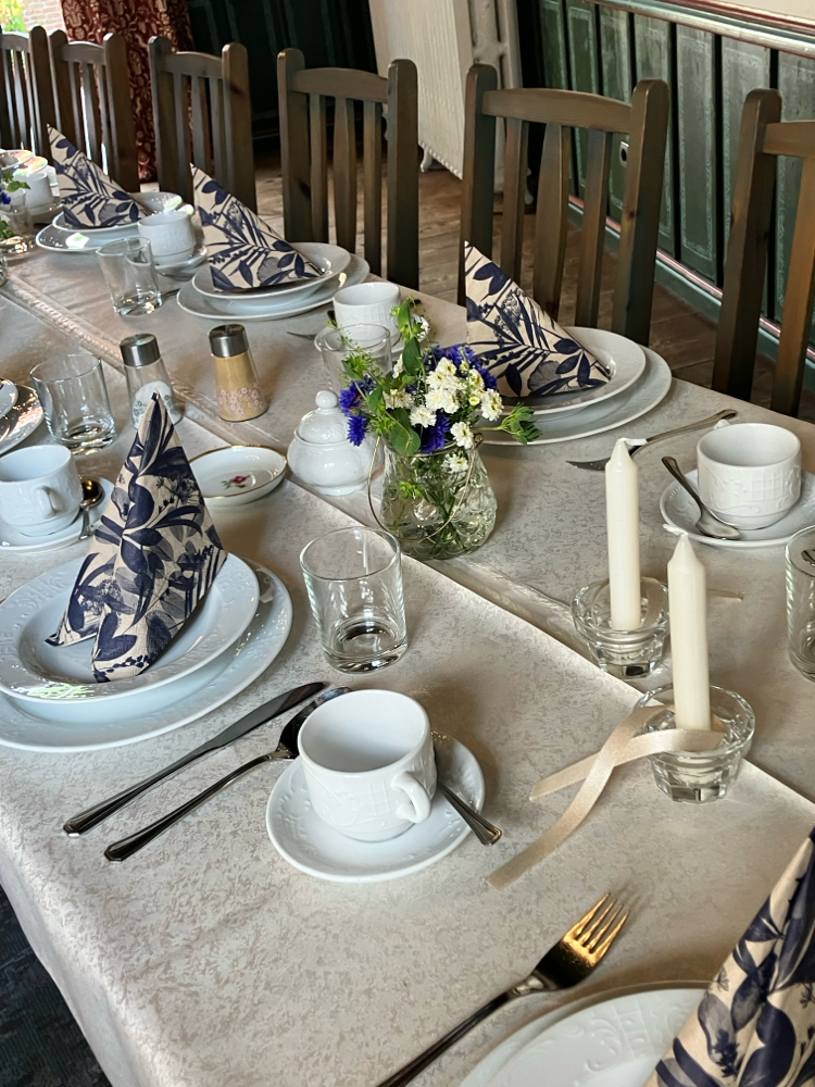 meldorf Zwei Brötchen (13, 14), Fleischsalat, Wurst (11), Käse, Marmelade, Rührei mit Bacon, Butter sowie ein 0,1l Orangensaft, dazu ein Kännchen Bio-Fair Trade Kaffee, Bio-Tee oder Schokolade |